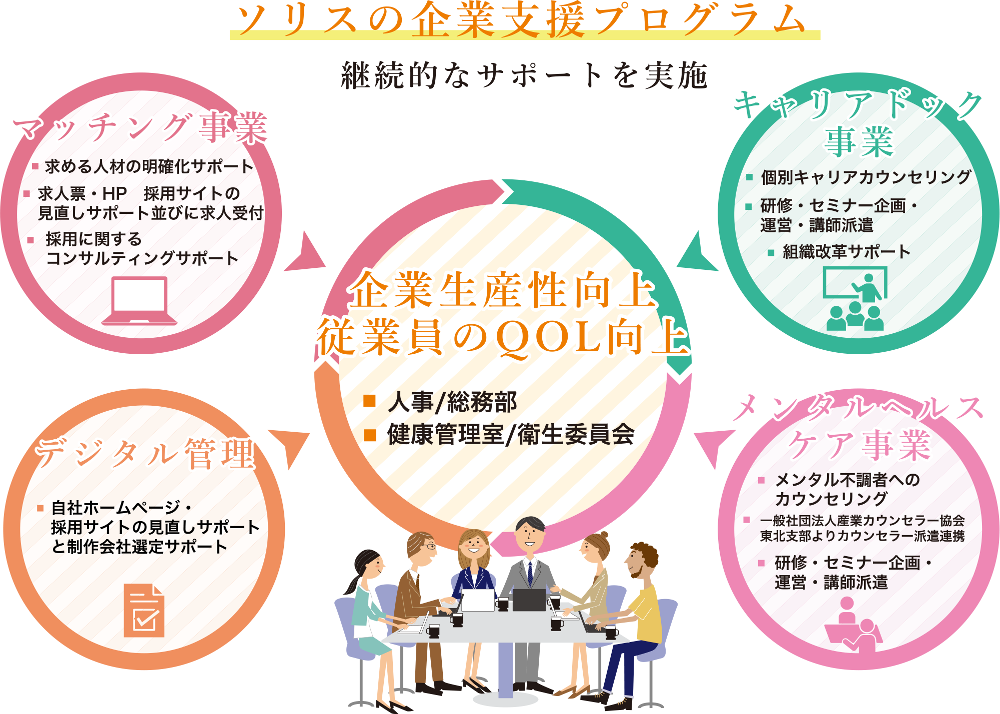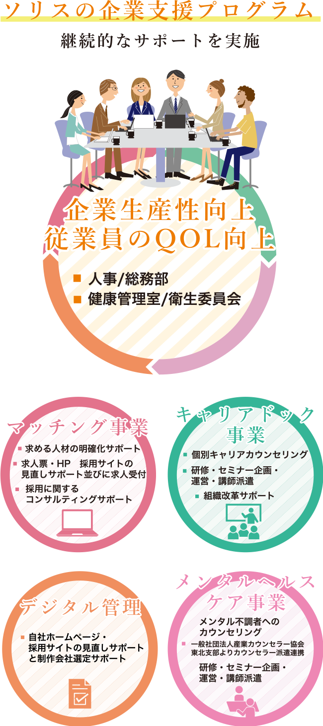 私はこれまで、福島県の求職者支援事業を通じて、企業と求職者双方の声に直接耳を傾け、課題を解決するための活動を続けてまいりました。地域を取り巻く環境は、少子高齢化や若年層の人口流出、労働力人口の減少といった厳しい現実に直面しています。その中で、企業は人材不足や人材育成の課題、メンタルヘルスケアの必要性に頭を悩ませています。一方で、求職者の皆様は、安定した収入やワークライフバランス、自身の成長機会を求めており、企業とのミスマッチが多く見受けられ、早期離職に繋がる状況になっております。 これらの課題を克服するために、これまでの活動を通じて働く環境や人材育成への投資の重要性、そしてそれを支援する仕組みが必要と強く感じ、この想いから独自の企業支援プログラムを開発しました。 Solis企業支援プログラムは、企業の皆様が直面する課題を解決し、持続的な成長を支えるために設計されています。このプログラムをご活用いただくことで、企業の採用力向上、人材の早期戦力化、職場環境の改善、さらには離職率低下や生産性向上といった具体的な成果を上げることが可能です。企業の皆様が本来の業務に専念できる環境を整えるとともに、従業員の皆様には成長とやりがいを感じていただける職場づくりをお手伝いいたします。 これらの取り組みは、単なるコストではなく、企業のブランド力を高める投資であると私は確信しています。企業と従業員、そして地域社会が共に成長する未来を目指し、寄り添った支援を続けてまいります。 Solisはラテン語で『太陽』を意味します。私どもは、太陽のようにすべての人に平等に明るい未来を照らす存在でありたいと考えています。 株式会社ソリス 代表取締役 安齋明美 |